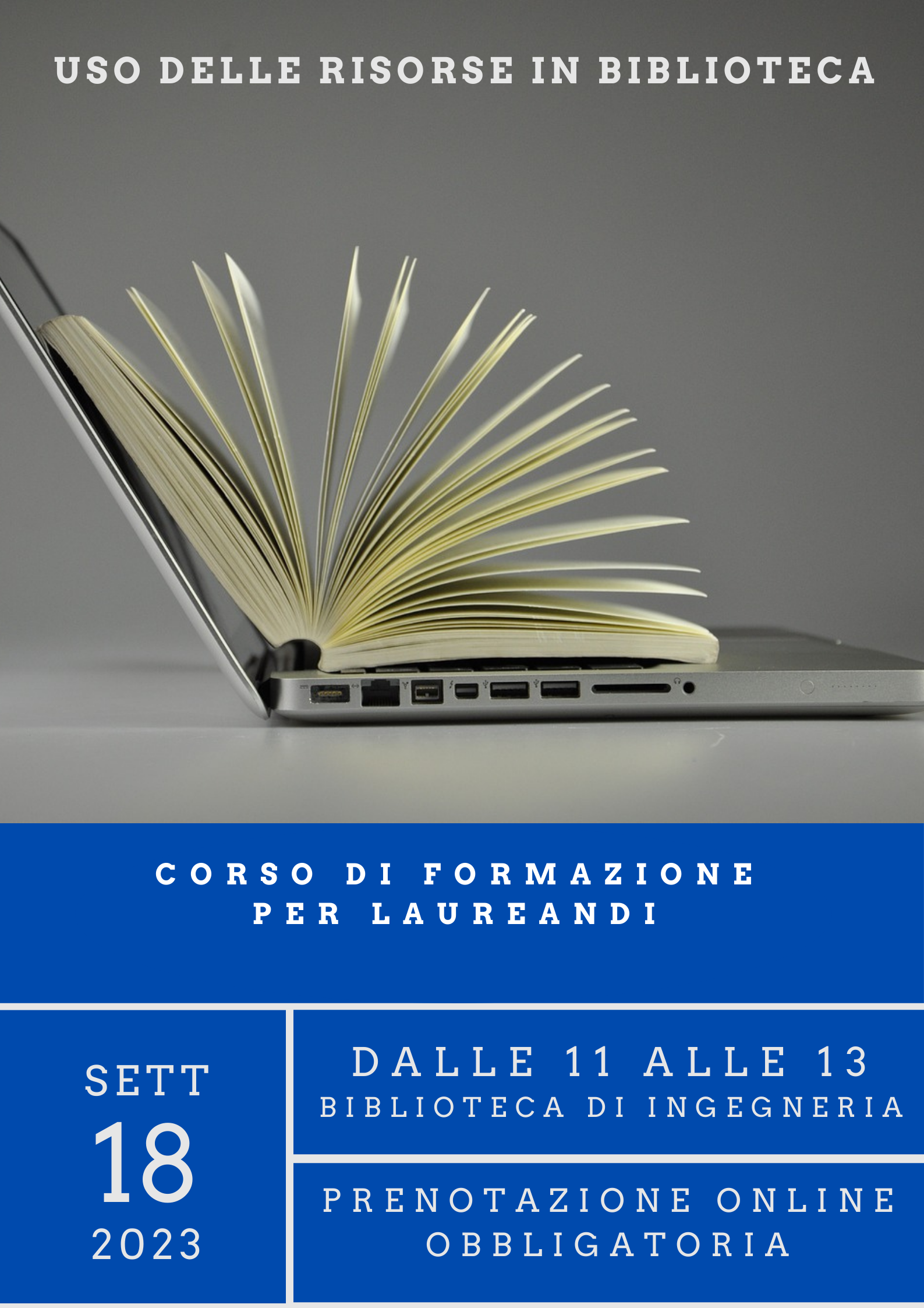 Il giorno 18 Settembre, dalle ore 11.00 alle ore 13, la Biblioteca di Ingegneria organizza un corso di formazione bibliografica riservato ai laureandi.