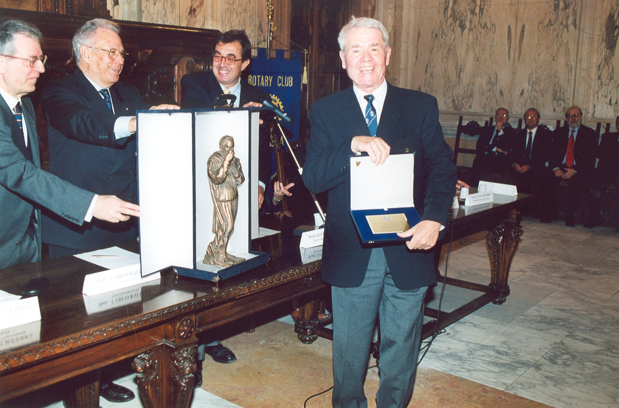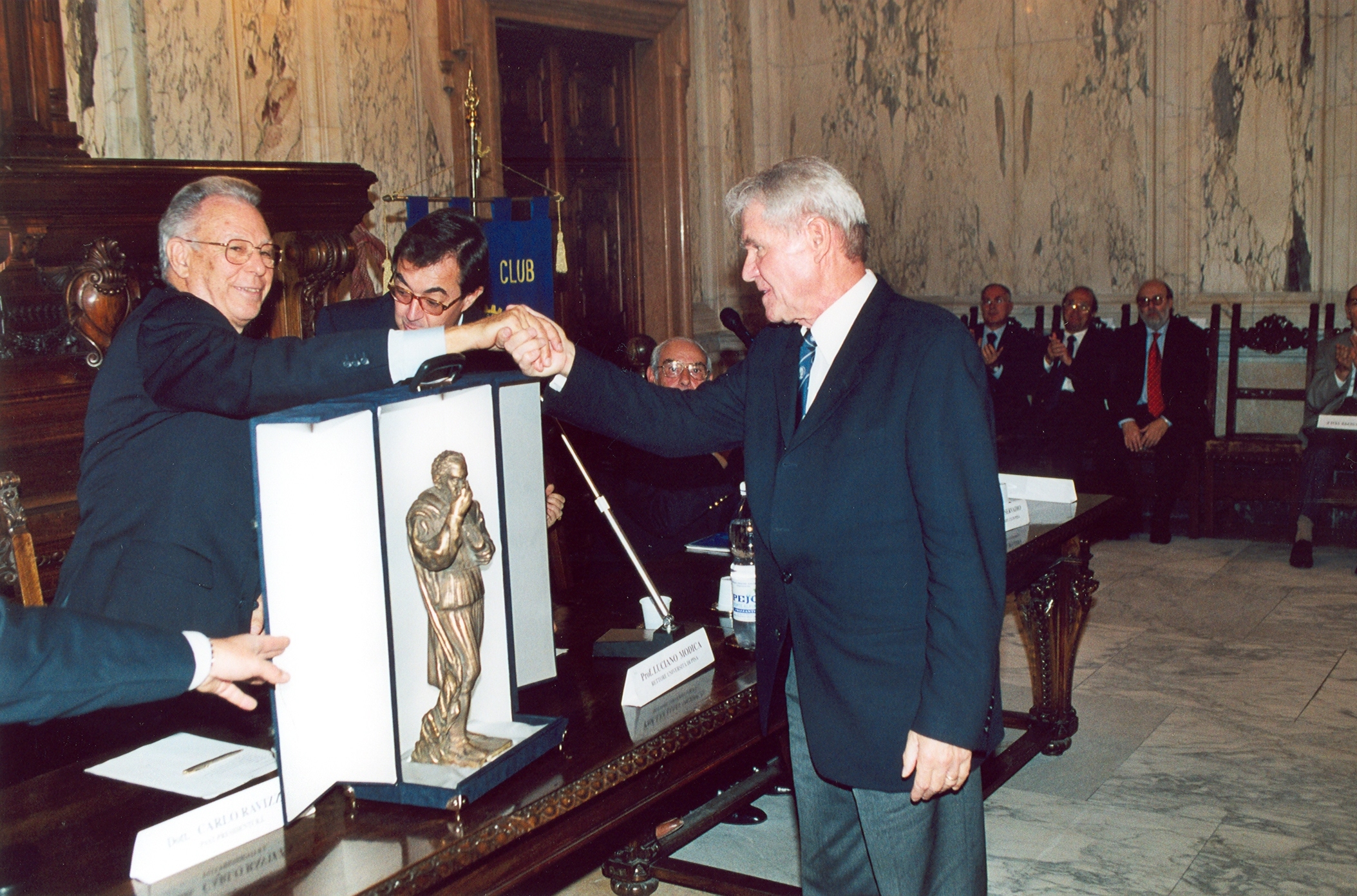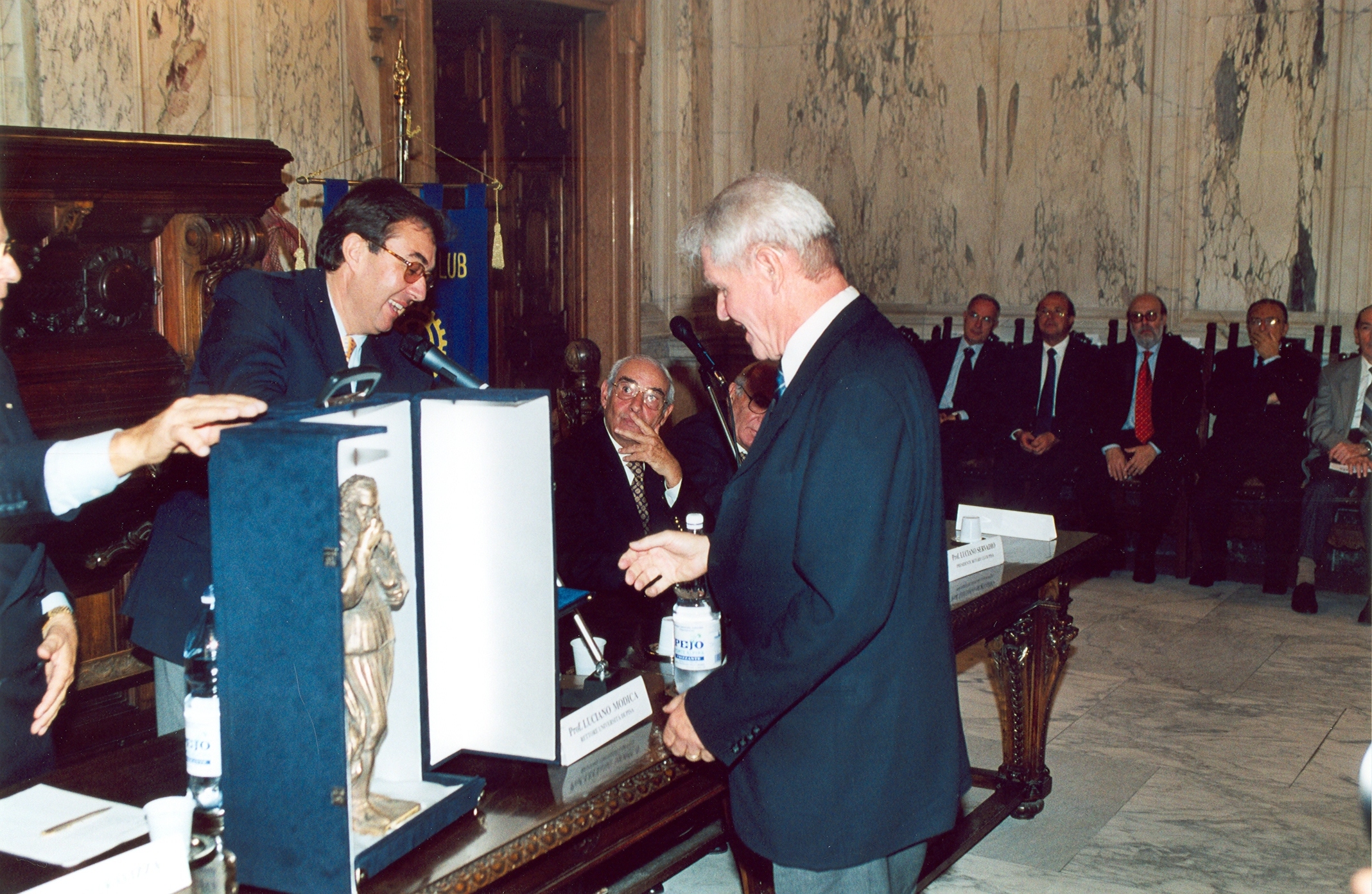 Alla fine mi permetto alcune parole personali. Nel corso della mia vita ho conosciuto l’Italia assai bene. Sono andato a piedi sul bordo della pianura pontina da Sezze Romano a Cori. Ho attraversato in una marcia di 14 ore i Monti Sibillini da Castelluccio di Norcia in Umbria a Montemonaco nelle Marche; i pastori ci hanno insegnato l’unica discesa verso il lago di Pilato. Ho provato l’ospitalità siciliana, quando, andando da Erice verso Segesta, non abbiamo trovato il minimo albergo a Buseto Palizzolo. Le città italiane non erano per me solo sedi di musei che contengono iscrizioni preromane; ho visitato anche le chiese romaniche o i palazzi rinascimentali. Lecce, capitale delle iscrizioni messapiche, mi ha entusiasmato col suo barocco, tanto differente da quello bavarese che conoscevo. Un dipinto del Caravaggio, che per me è il più grande pittore non solo d’Italia, mi poteva deviare dalla via diretta per arrivare al prossimo museo o al prossimo convegno. Questi convegni sono una roba faticosa, ma hanno indiscutibili valori: permettono lo scambio di idee e di informazioni, facilitano il contatto con giovani interessati e sono una splendida occasione di trovare e di ritrovare amici. Io stesso ho avuto la fortuna di aver trovato fra i miei colleghi italiani amici, buoni amici, buonissimi amici; sono molto riconoscente di ciò. Parimenti ringrazio tutti i presenti di aver ascoltato le mie parole, e ringrazio di nuovo dell’onore che mi è stato dimostrato con il conferimento del premio Galileo Galilei.