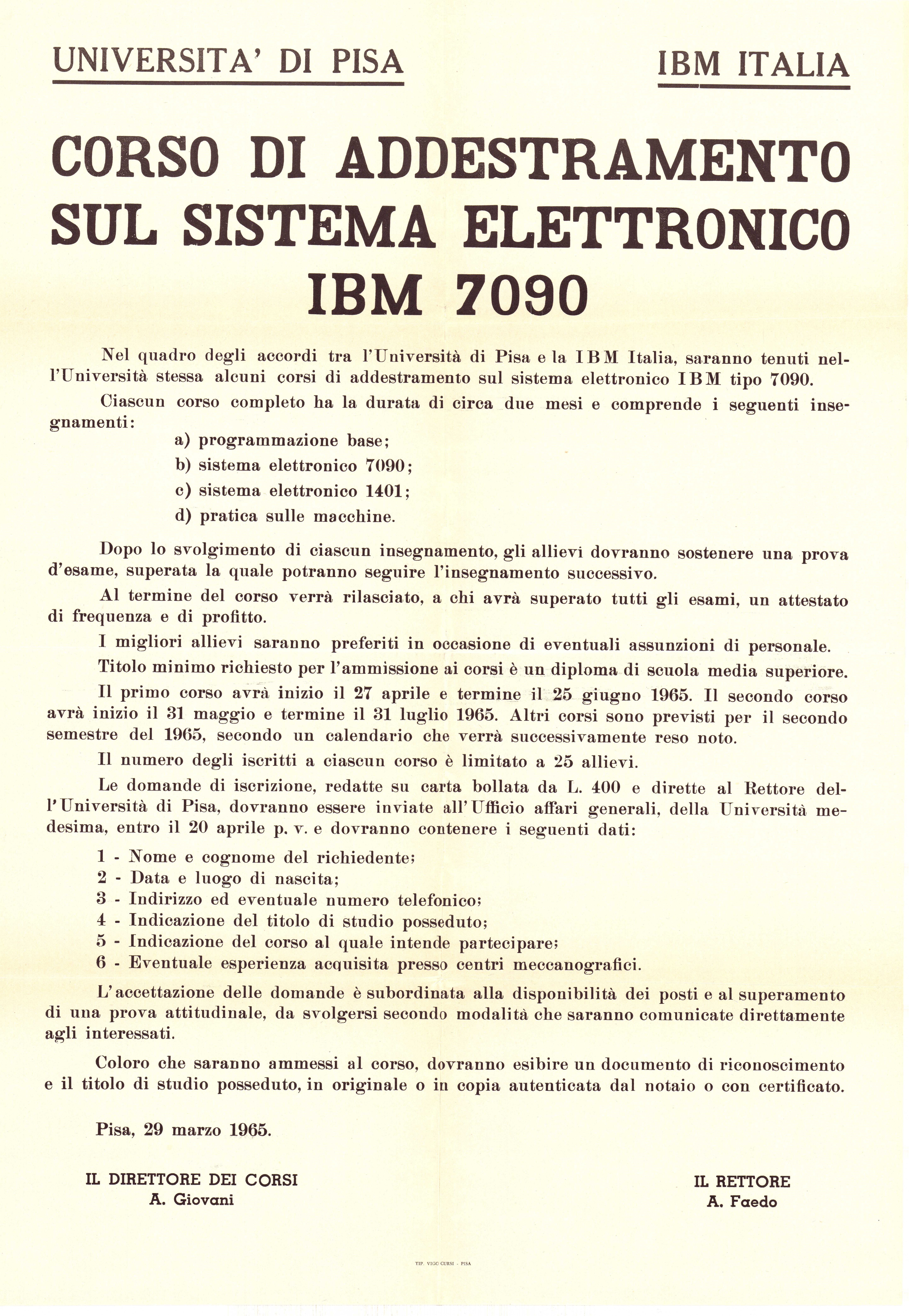CNUCE, via Santa Maria, 36. Documenti: 1964.03.31 - Minuta di lettera del Rettore 1965.02.16 - Minuta di lettera del Rettore al Ministero della pubblica istruzione 1965.03.29 - Corso di addestramento sul sistema elettronico IBM 7090 1965.07.30 - Minuta di lettera del Rettore a Ludovico Biraghi Lossetti Corsi 7090 Personale necessario al Centro elettronico IBM 7090/1401 Organizzazione di un Centro elettronico IBM 7090/1401 Log in to post comments