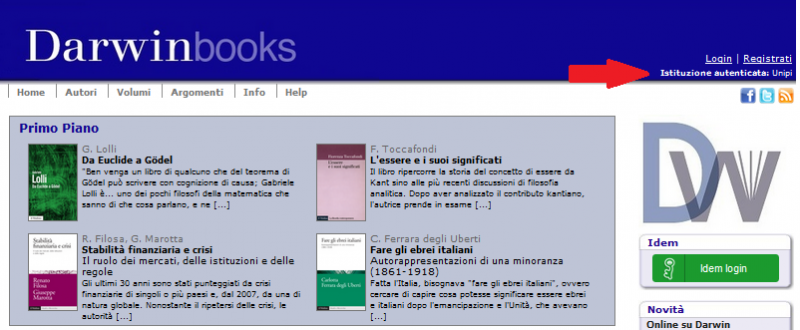 Tra le piattaforme di ebook offerte dal Sistema Bibliotecario di Ateneo è disponibile Darwinbooks, l’archivio digitale della casa editrice Il Mulino, organizzato in collezioni disciplinari tra cui Storia, Scienza politica, Sociologia, Economia, Diritto. I testi attualmente offerti sono oltre ottocento e la collezione è aggiornata quadrimestralmente con novità pubblicate nelle otto collane incluse. Per visualizzare i volumi online è sufficiente accedere a Darwinbooks dall’interno della rete di ateneo oppure da postazioni esterne (ad esempio da casa) mediante unipiVPN seguendo le istruzioni qui indicate. Solo per utilizzare i servizi individuali (quali commenti, stampa e download) è necessario registrarsi.