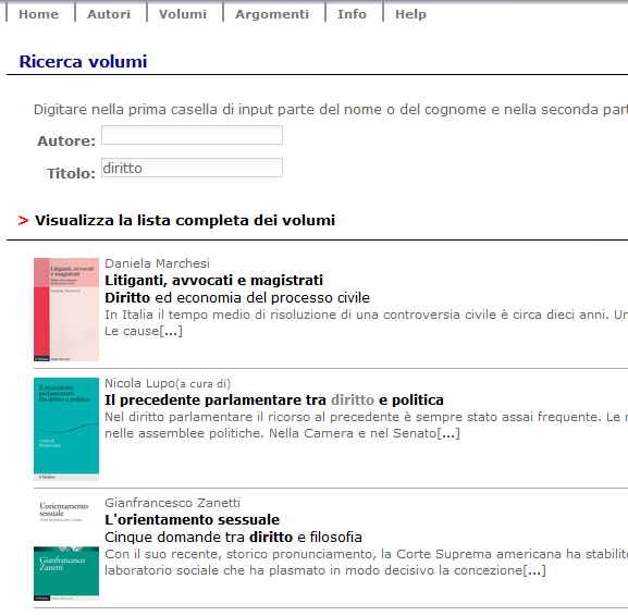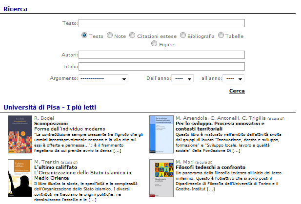 A partire dalla Home Page è possibile eseguire, dal menù orizzontale sotto la testata, una ricerca solo fra gli autori, tra i volumi (autore e titolo), o per argomento.