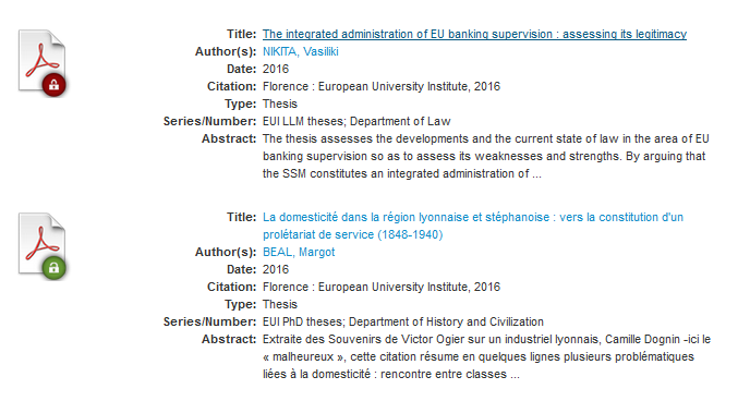 L’Istituto Universitario Europeo ha recentemente portato a termine il progetto di digitalizzazione retrospettiva delle tesi, per cui è adesso disponibile l’intero archivio delle tesi sostenute presso l’Istituto dal 1979. Tutte le tesi possono essere ricercate per scorrimento e dalla lista sono immediatamente individuabili quelle ad accesso aperto (lucchetto verde) o in modalità embargo e quindi temporaneamente escluse dalla consultazione (lucchetto rosso). Lo scorrimento può essere effettuato per data, autore, titolo, soggetto, diritti (accesso aperto oppure embargo).
