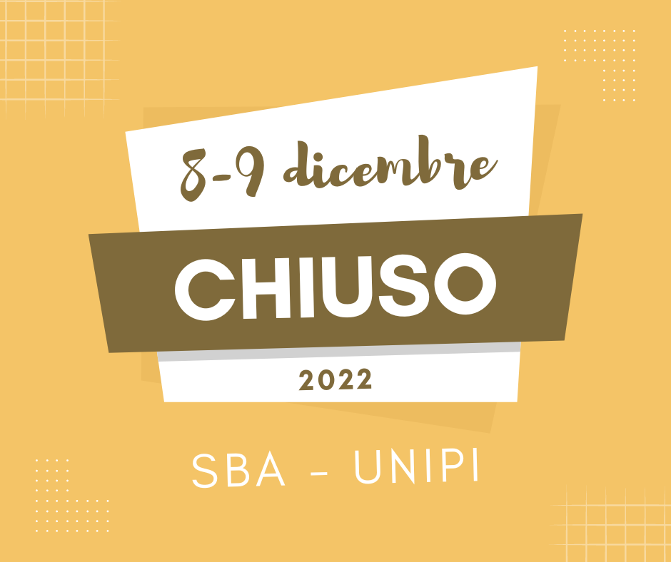 Si avvisa che tutte le biblioteche del Sistema Bibliotecario di Ateneo saranno chiuse giovedì 8 dicembre 2022 (festa dell'Immacolata Concezione), e venerdì 9 dicembre. Riapriranno con il consueto orario lunedì 12 dicembre.
