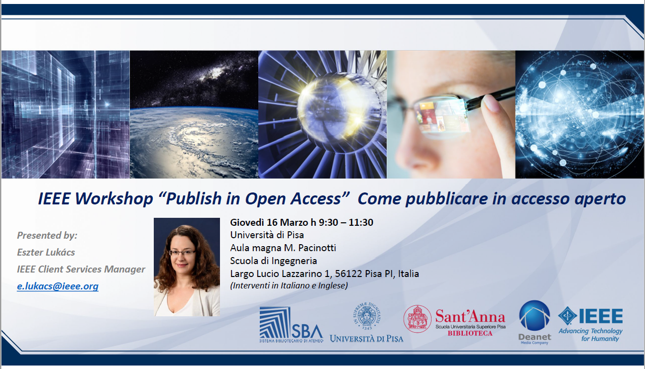 Il Sistema Bibliotecario di Ateneo dell’Università di Pisa e la Biblioteca della Scuola Superiore Sant'Anna hanno organizzato un seminario dal titolo “Publish in open access : come pubblicare in accesso aperto”, che si svolgerà giovedì 16 marzo, dalle ore 9:30 alle ore 11:30, presso l’Aula magna M.Pacinotti della Scuola di Ingegneria (Largo Lucio Lazzarino 1).
