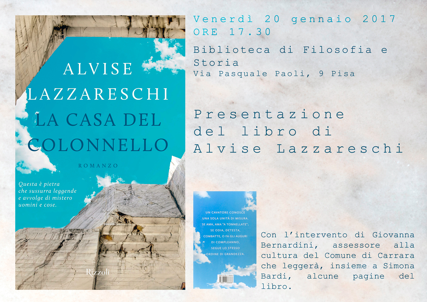 Venerdì 20 gennaio 2017 ore 17.30 presso la Biblioteca di Filosofia e Storia in Via Pasquale Paoli, 9 a Pisa (maps) Alvise Lazzareschi, presentato da Giovanna Bernardini, assessore alla cultura del comune di Carrara, leggerà, insieme a Simona Bardi, alcune pagine del suo libro: La casa del colonnello, edito da Rizzoli.