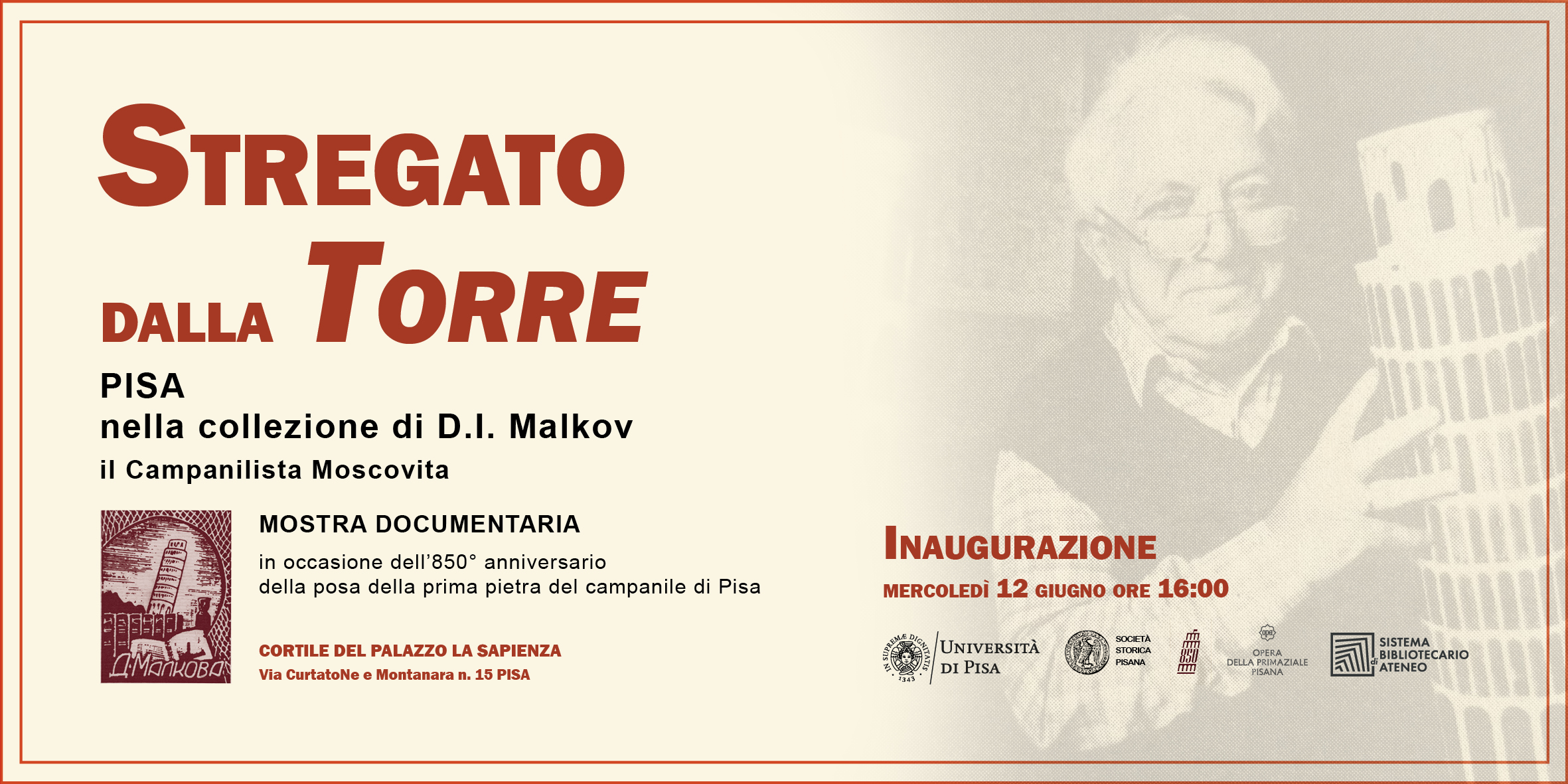 In occasione dell'850° anniversario della posa della prima pietra del Campanile di Pisa, dal 12 giugno al 31 luglio si terrà la mostra dal titolo 'Stregato dalla Torre - Pisa nella collezione di D.I Malkov, il Campanilista Moscovita', proposta dall’Università di Pisa, in collaborazione con la Società Storica Pisana, presso il Cortile del Palazzo La Sapienza, Università di Pisa, via Curtatone e Montanara 15.