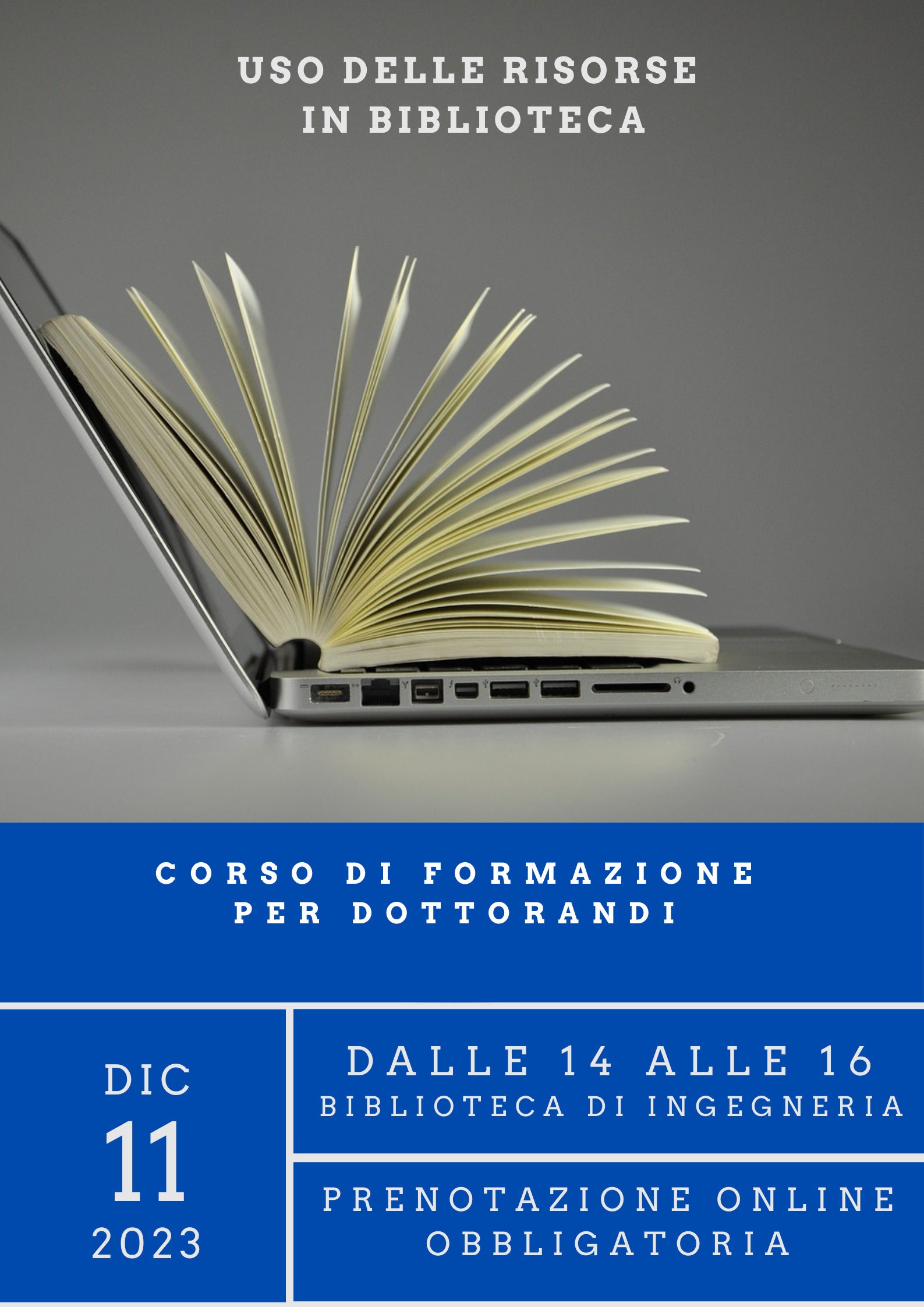 Il giorno 11 Dicembre, dalle ore 14.00 alle ore 16, la Biblioteca di Ingegneria organizza un corso di formazione bibliografica riservato ai dottorandi.