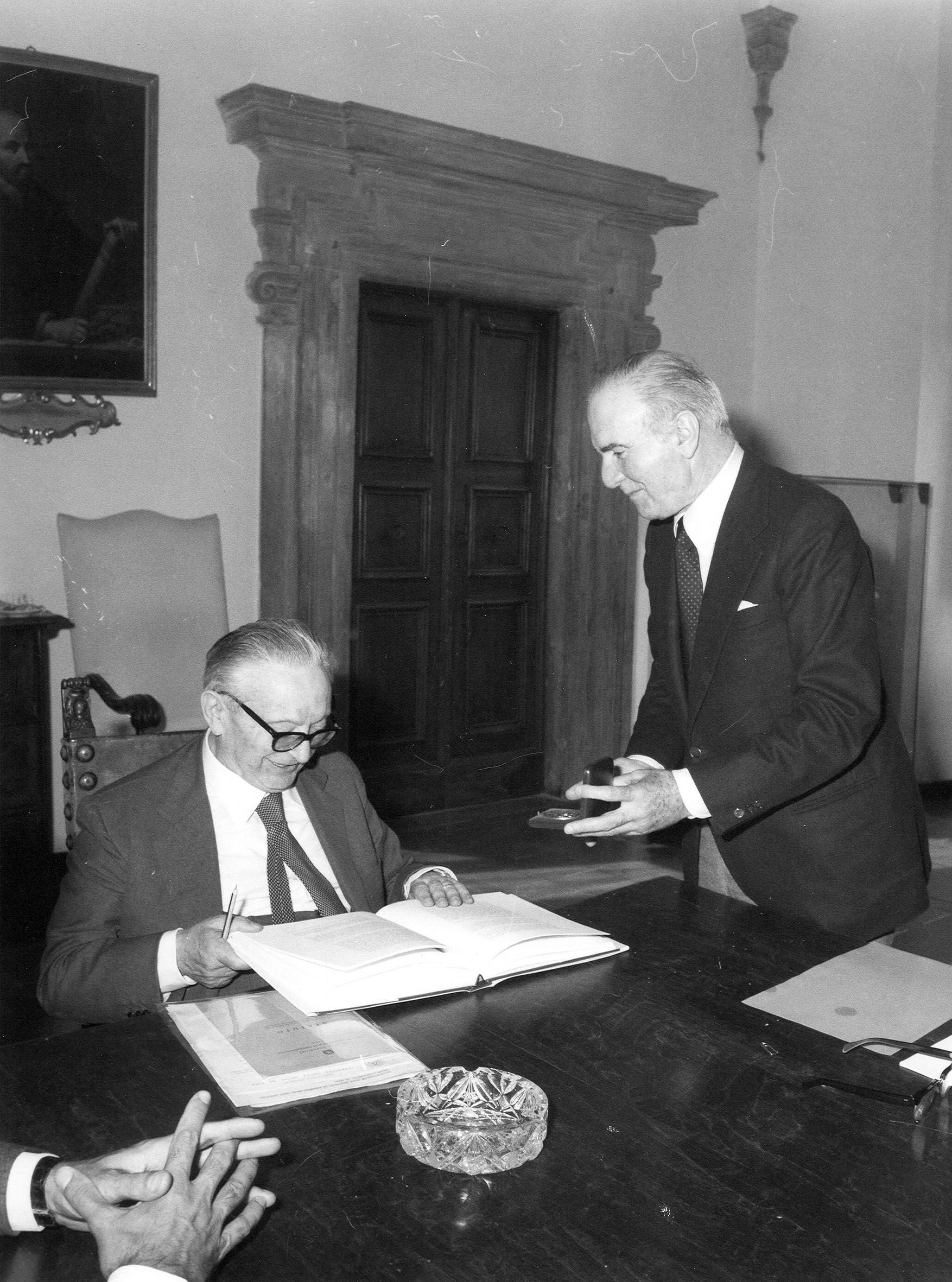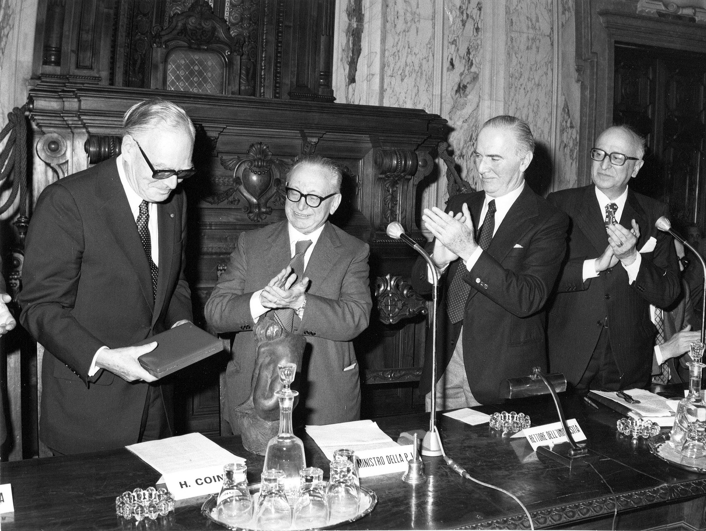 Mi pare che l’influenza della scienza giuridica italiana sia senz’altro comparabile all’influenza dell’arte italiana, in particolare ai grandi modelli dell’architettura e della pittura del Rinascimento e del Barocco. A questo punto mi permettano di concludere con una osservazione personale. La mia attività scientifica è stata costantemente dedicata alla scienza giuridica, per una buona parte alla storia del diritto. La mia predilezione personale va tuttavia piuttosto all’architettura del Rinascimento e del Barocco italiani, va a un Brunelleschi, a un Bramante, a un Bernini. Io credo di far parte di quel grande numero di miei compatrioti tedeschi, che vedono nell’Italia una loro seconda patria ed è perciò con profonda commozione che ricevo questa onorificenza italiana.
