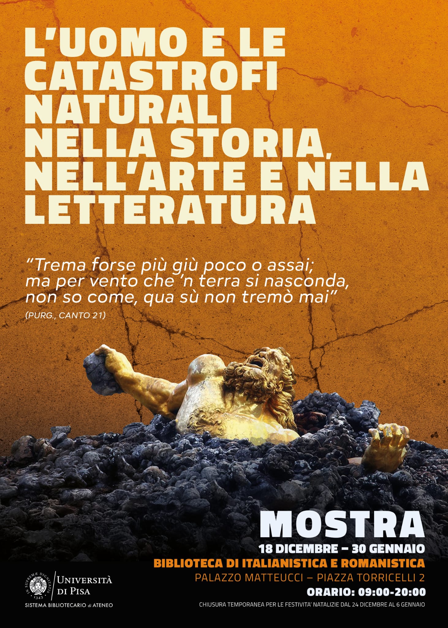L'uomo e le catastrofi naturali nella storia nell'arte e nella letteratura mostra curata da Laura Gigli, Cinzia Romagnoli e Elena Franchini e presentata il 17 dicembre in occasione dell’apertura del convegno internazionale Il risveglio di Encelado. Un’indagine transdisciplinare sul rischio e il disastro geologico (17-19 dicembre). La mostra è visitabile dal 18 dicembre al 30 gennaio 2026 presso la Biblioteca di Italianistica e Romanistica del Polo 6, a ingresso libero.