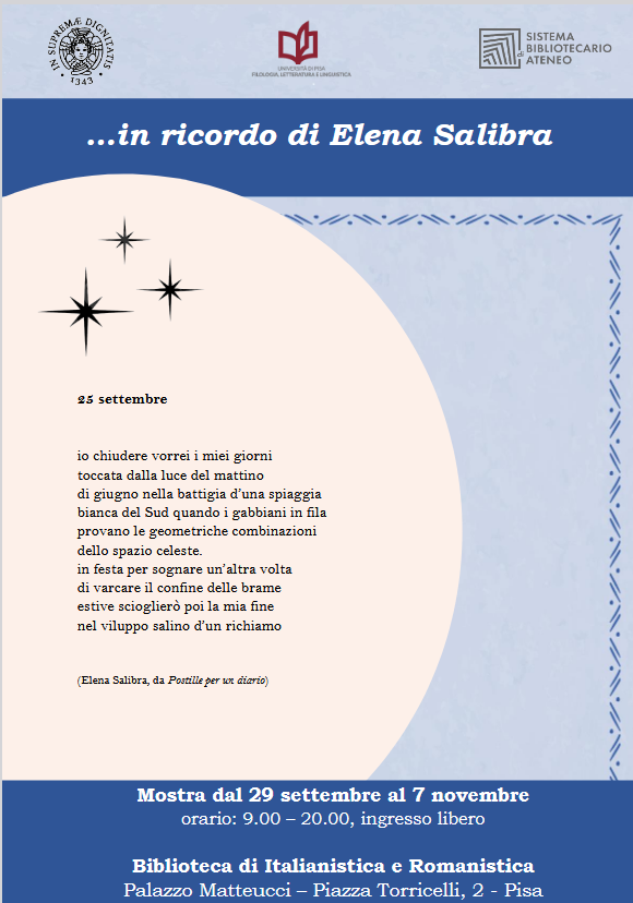 ...in ricordo di Elena Salibra, mostra presso la Biblioteca di Italianistica e romanistica: in occasione della presentazione del libro Postille per un libro [in versi] è stata allestita una mostra dedicata a Elena Salibra: le poesie, gli studi, le opere e i convegni in omaggio al suo ricordo.