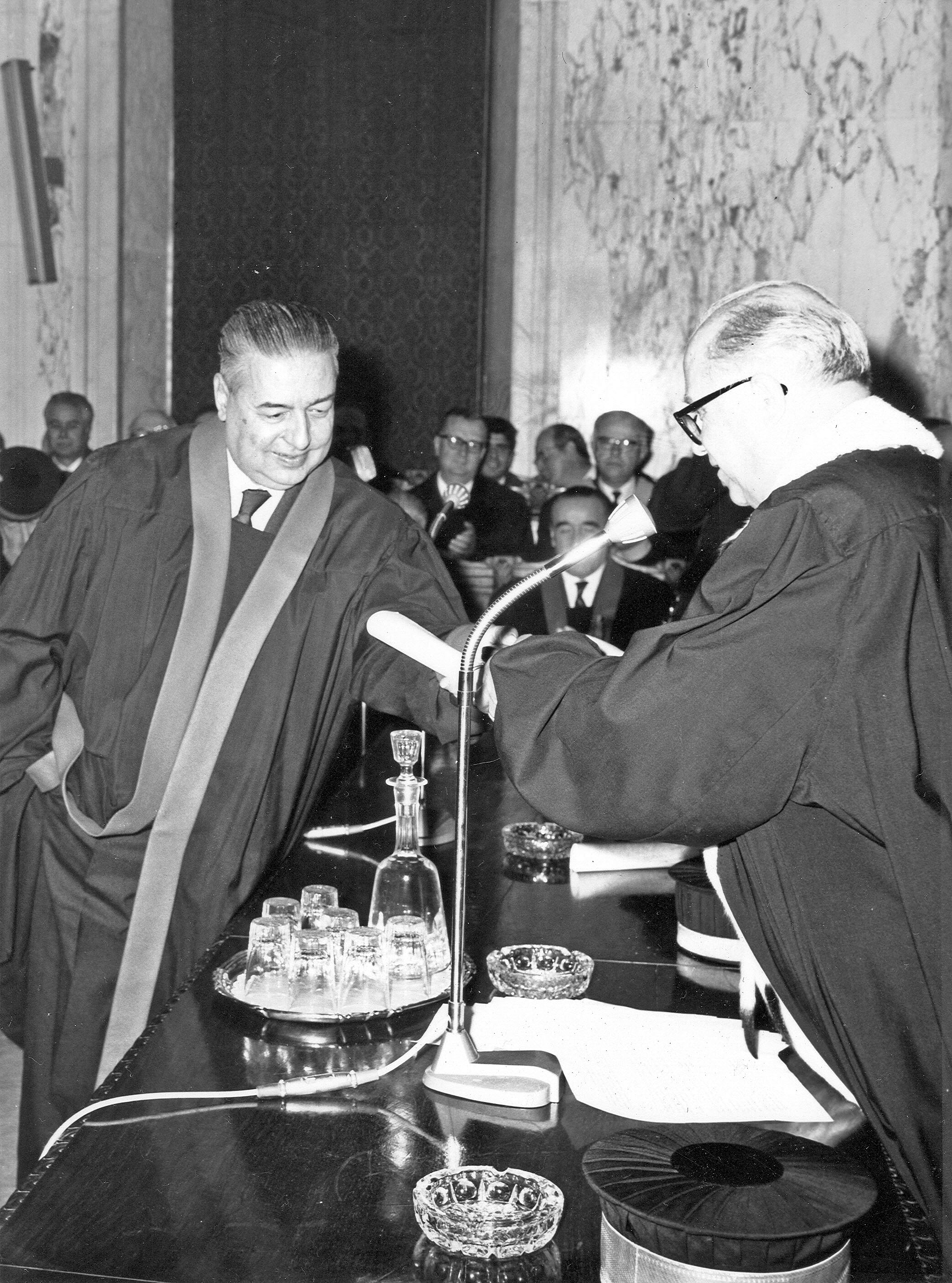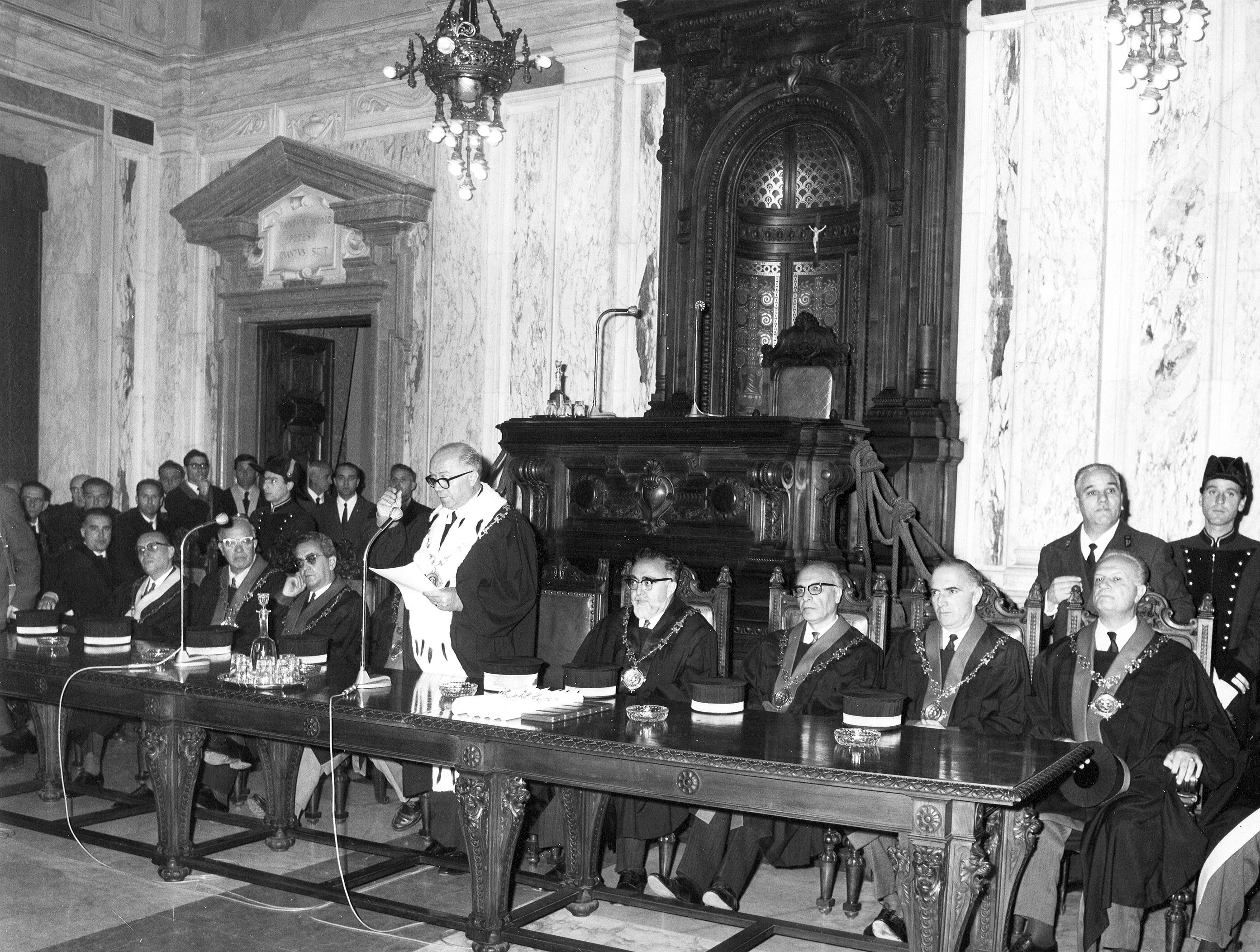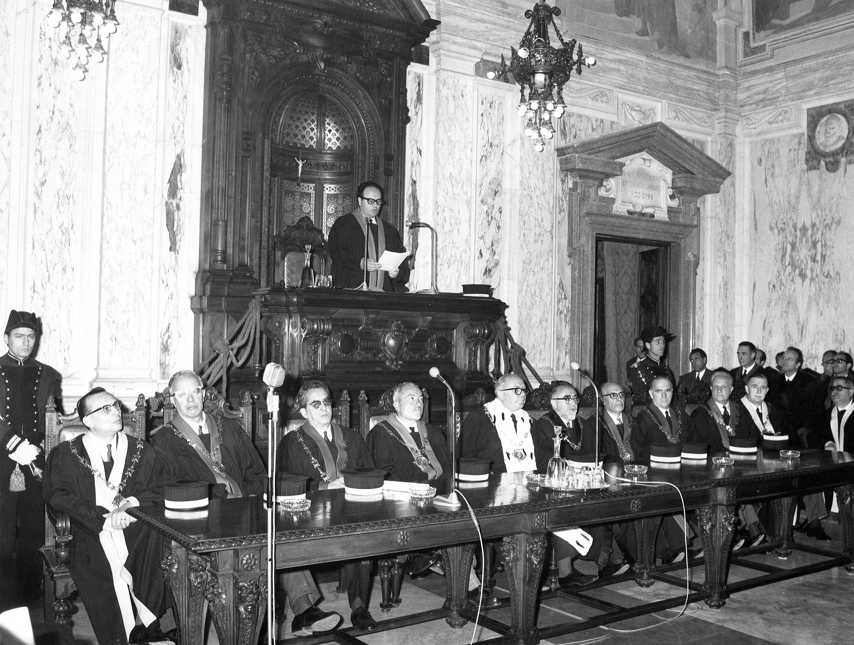 Prima di dare la parola al prof. Elio Fazzalari, ordinario di diritto processuale civile, che terrà la prolusione ufficiale sul tema «Problemi della giustizia in Italia», consegnerò agli illustri maestri professori: Lucio Lazzarino, Folco Domenici, Curzio Massart, Nestore Bernardo Cacciapuoti. Mario de Vergottini, la medaglia d’oro di benemeriti della Scuola della cultura e della arte, loro conferita dal Presidente della Repubblica, quale riconoscimento della Nazione per l’opera da essi svolta a vantaggio della Università italiana.